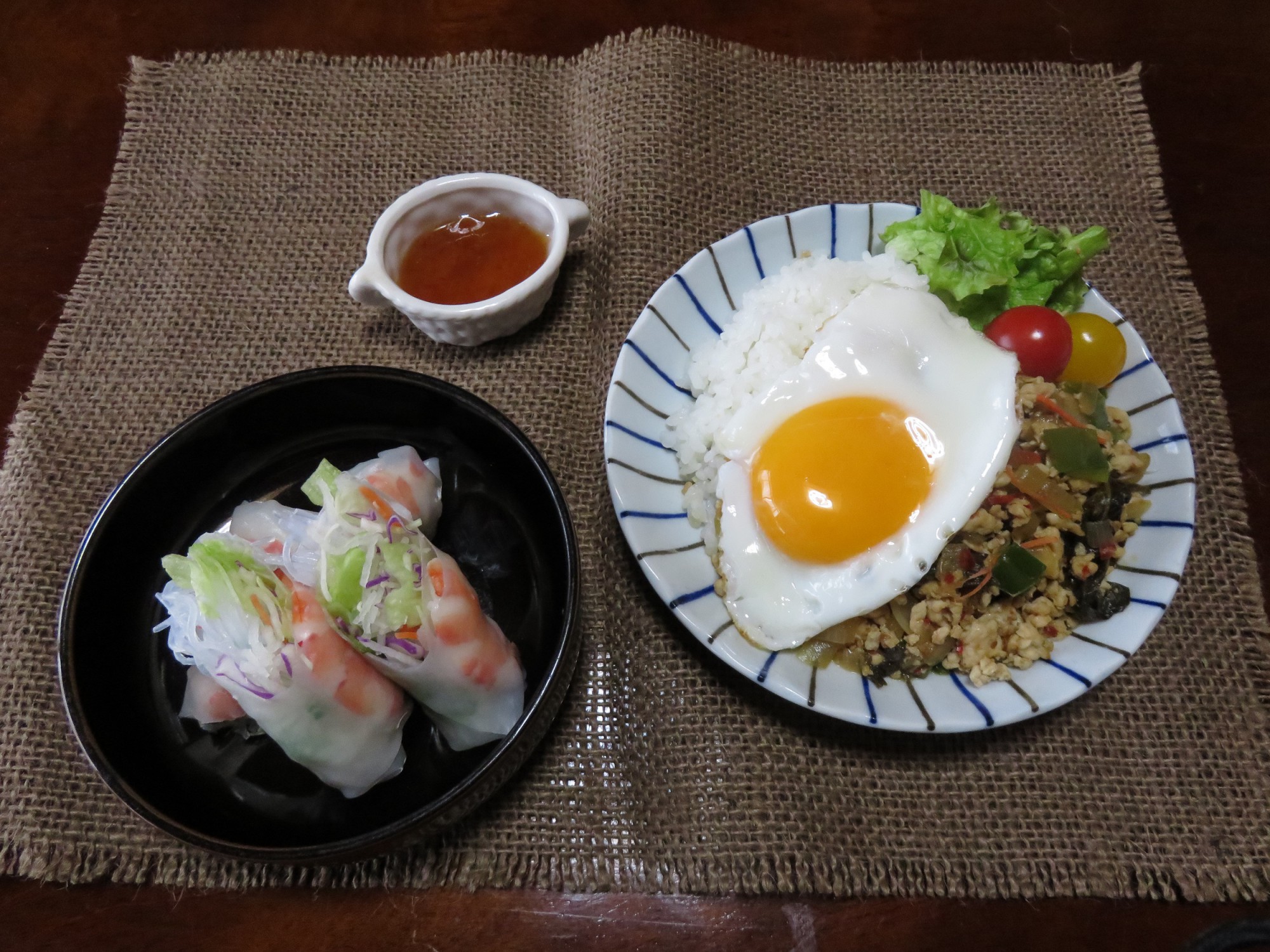 ライスペーパーでエビ、野菜巻く工程が楽しい。ソースは定番スイートチリソースと結構イケる和風のゴマドレの2種類で食す