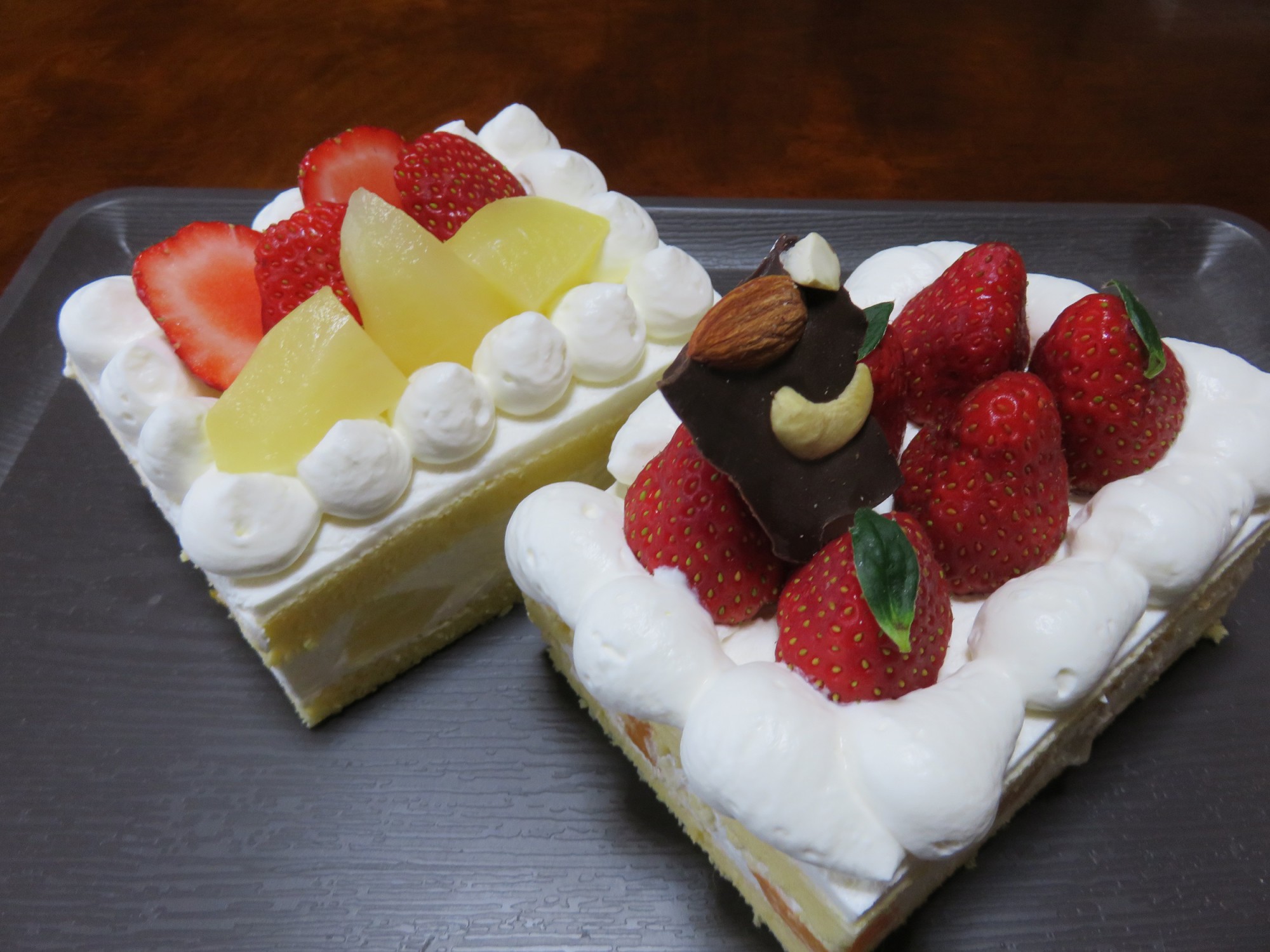 四角いケーキに生クリームを絞ったり、色とりどりのフルーツで飾ったり、